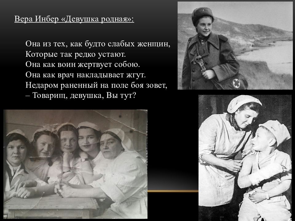 Вера Инбер «Девушка родная»: Она из тех, как будто слабых женщин, Которые так редко устают. Она как воин жертвует собою. Она как врач накладывает жгут. Недаром раненный на поле боя зовет, – Товарищ, девушка, Вы тут?