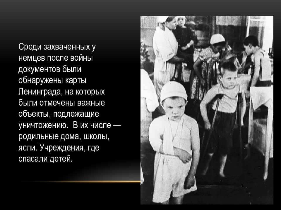 Среди захваченных у немцев после войны документов были обнаружены карты Ленинграда, на которых были отмечены важные объекты, подлежащие уничтожению. В их числе — родильные дома, школы, ясли. Учреждения, где спасали детей.