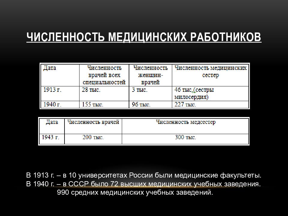 В 1913 г. – в 10 университетах России были медицинские факультеты. В 1940 г. – в СССР было 72 высших медицинских учебных заведения. 990 средних медицинских учебных заведений.