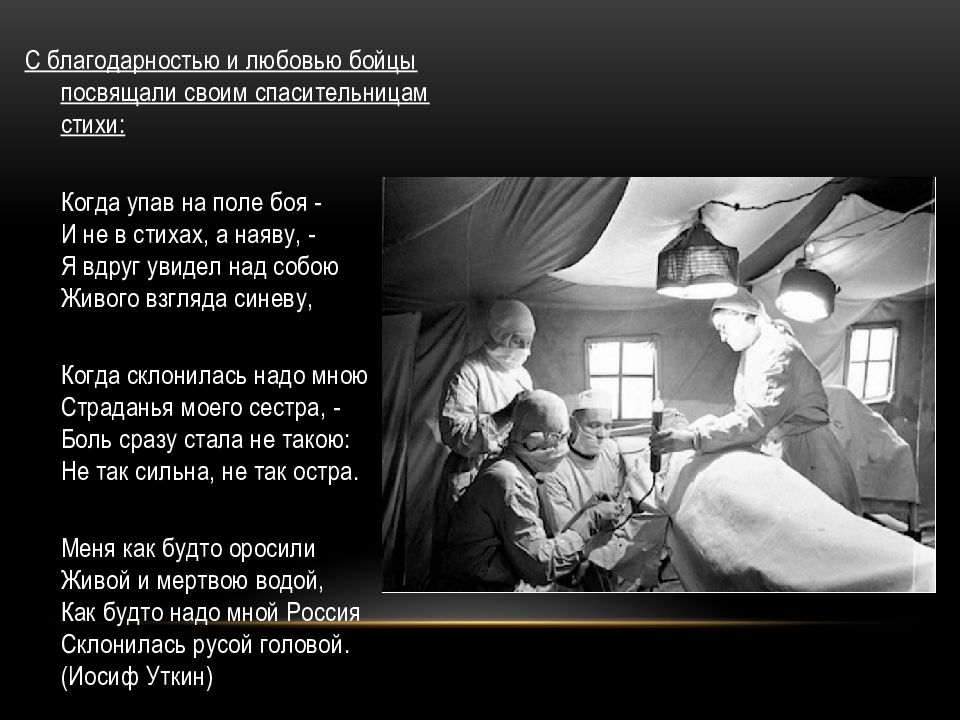 С благодарностью и любовью бойцы посвящали своим спасительницам стихи: Когда упав на поле боя - И не в стихах, а наяву, - Я вдруг увидел над собою Живого взгляда синеву, Когда склонилась надо мною Страданья моего сестра, - Боль сразу стала не такою: Не так сильна, не так остра. Меня как будто оросили Живой и мертвою водой, Как будто надо мной Россия Склонилась русой головой. (Иосиф Уткин)