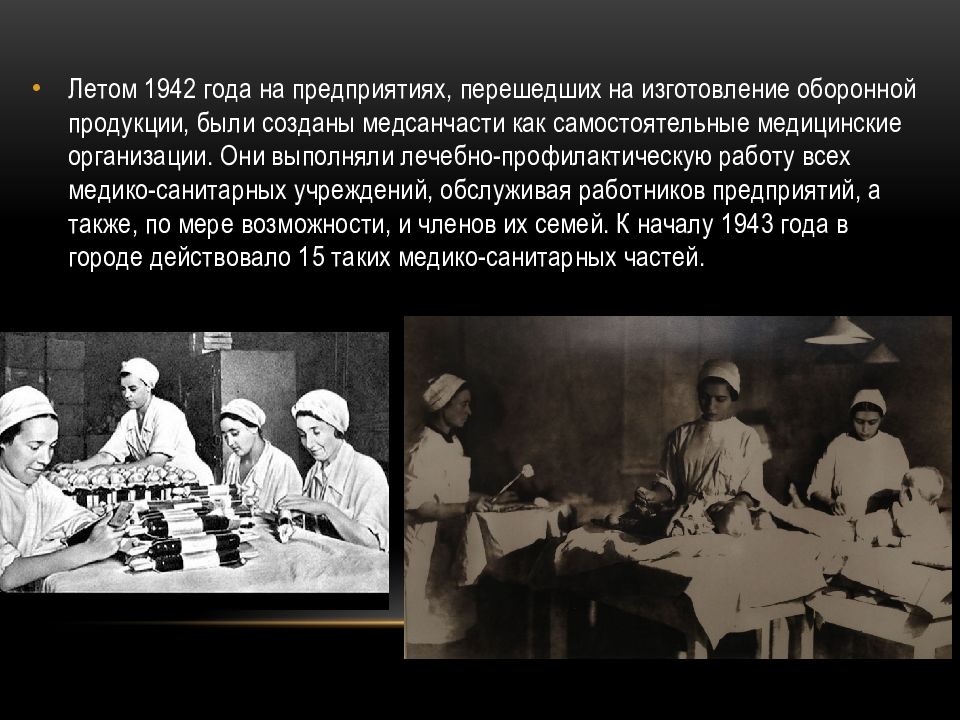 Летом 1942 года на предприятиях, перешедших на изготовление оборонной продукции, были созданы медсанчасти как самостоятельные медицинские организации. Они выполняли лечебно-профилактическую работу всех медико-санитарных учреждений, обслуживая работников предприятий, а также, по мере возможности, и членов их семей. К началу 1943 года в городе действовало 15 таких медико-санитарных частей.