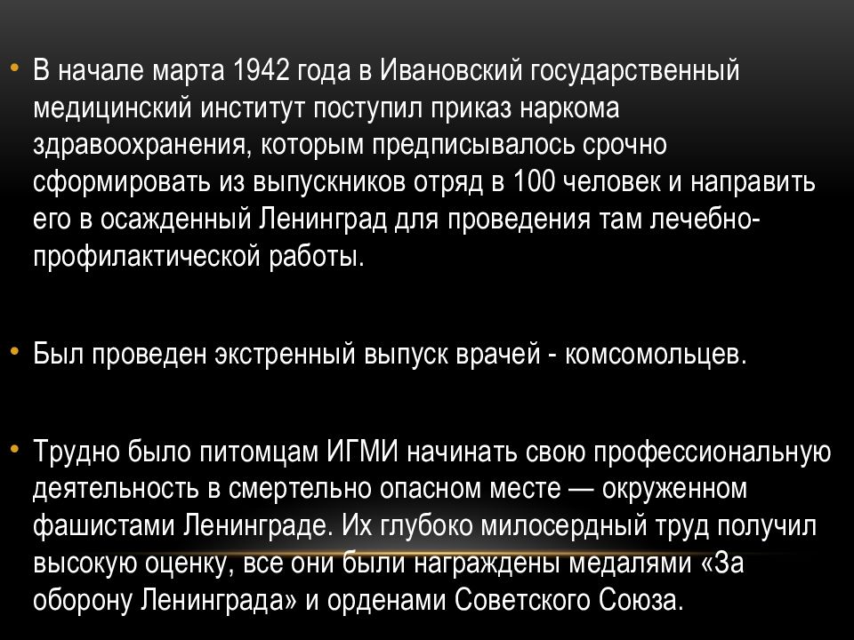 В начале марта 1942 года в Ивановский государственный медицинский институт поступил приказ наркома здравоохранения, которым предписывалось срочно сформировать из выпускников отряд в 100 человек и направить его в осажденный Ленинград для проведения там лечебно-профилактической работы. Был проведен экстренный выпуск врачей - комсомольцев. Трудно было питомцам ИГМИ начинать свою профессиональную деятельность в смертельно опасном месте — окруженном фашистами Ленинграде. Их глубоко милосердный труд получил высокую оценку, все они были награждены медалями «За оборону Ленинграда» и орденами Советского Союза.