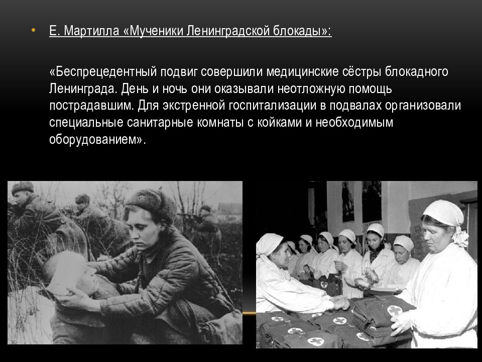 Е. Мартилла «Мученики Ленинградской блокады»: «Беспрецедентный подвиг совершили медицинские сёстры блокадного Ленинграда. День и ночь они оказывали неотложную помощь пострадавшим. Для экстренной госпитализации в подвалах организовали специальные санитарные комнаты с койками и необходимым оборудованием».