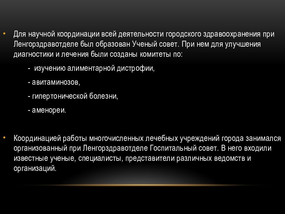 Для научной координации всей деятельности городского здравоохранения при Ленгорздравотделе был образован Ученый совет. При нем для улучшения диагностики и лечения были созданы комитеты по: - изучению алиментарной дистрофии, - авитаминозов, - гипертонической болезни, - аменореи. Координацией работы многочисленных лечебных учреждений города занимался организованный при Ленгорздравотделе Госпитальный совет. В него входили известные ученые, специалисты, представители различных ведомств и организаций.