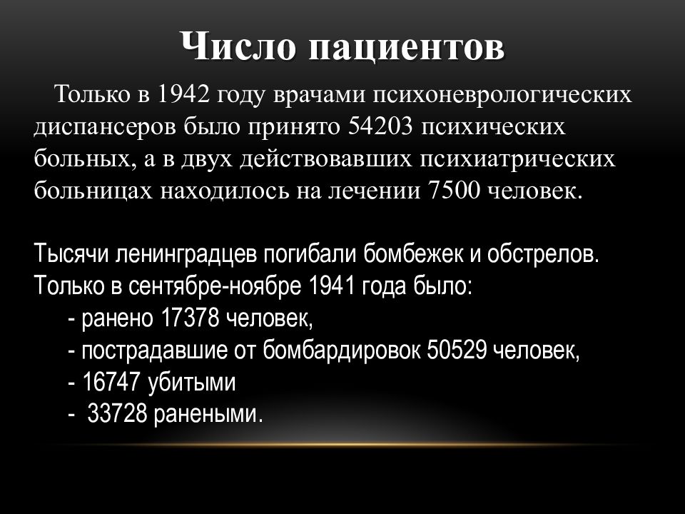 Число пациентов Только в 1942 году врачами психоневрологических диспансеров было принято 54203 психических больных, а в двух действовавших психиатрических больницах находилось на лечении 7500 человек. Тысячи ленинградцев погибали бомбежек и обстрелов. Только в сентябре-ноябре 1941 года было: - ранено 17378 человек, - пострадавшие от бомбардировок 50529 человек, - 16747 убитыми - 33728 ранеными.
