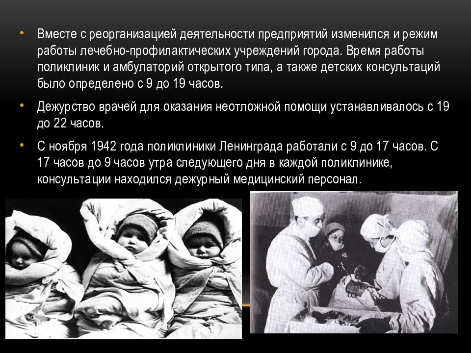 Вместе с реорганизацией деятельности предприятий изменился и режим работы лечебно-профилактических учреждений города. Время работы поликлиник и амбулаторий открытого типа, а также детских консультаций было определено с 9 до 19 часов. Дежурство врачей для оказания неотложной помощи устанавливалось с 19 до 22 часов. С ноября 1942 года поликлиники Ленинграда работали с 9 до 17 часов. С 17 часов до 9 часов утра следующего дня в каждой поликлинике, консультации находился дежурный медицинский персонал.