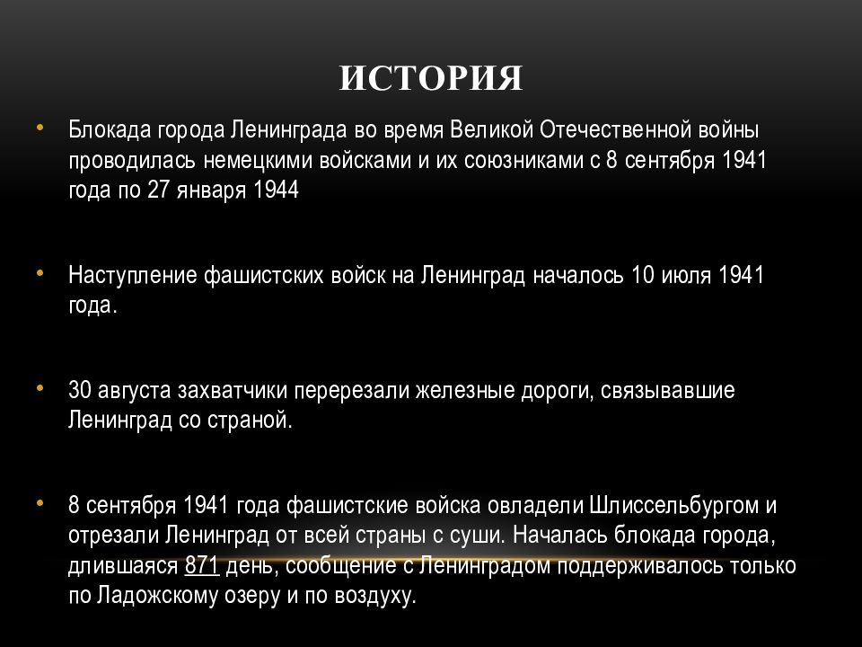 Блокада города Ленинграда во время Великой Отечественной войны проводилась немецкими войсками и их союзниками с 8 сентября 1941 года по 27 января 1944 Наступление фашистских войск на Ленинград началось 10 июля 1941 года. 30 августа захватчики перерезали железные дороги, связывавшие Ленинград со страной. 8 сентября 1941 года фашистские войска овладели Шлиссельбургом и отрезали Ленинград от всей страны с суши. Началась блокада города, длившаяся 871 день, сообщение с Ленинградом поддерживалось только по Ладожскому озеру и по воздуху.