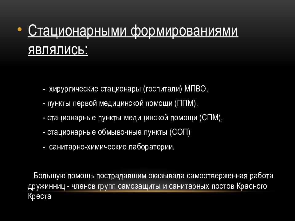 Стационарными формированиями являлись: - хирургические стационары (госпитали) МПВО, - пункты первой медицинской помощи (ППМ), - стационарные пункты медицинской помощи (СПМ), - стационарные обмывочные пункты (СОП) - санитарно-химические лаборатории. Большую помощь пострадавшим оказывала самоотверженная работа дружинниц - членов групп самозащиты и санитарных постов Красного Креста