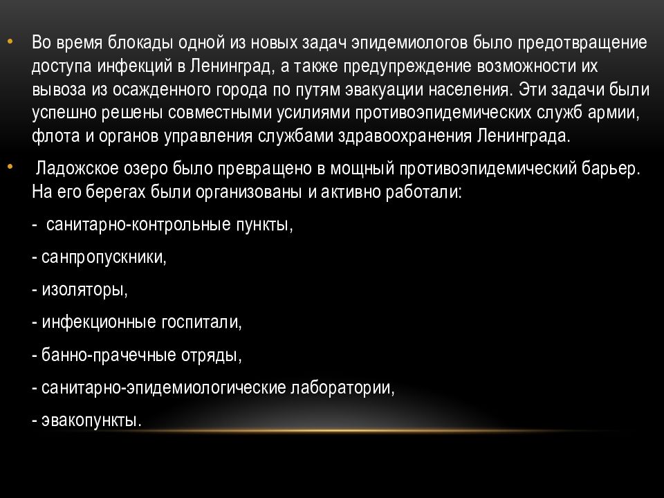 Во время блокады одной из новых задач эпидемиологов было предотвращение доступа инфекций в Ленинград, а также предупреждение возможности их вывоза из осажденного города по путям эвакуации населения. Эти задачи были успешно решены совместными усилиями противоэпидемических служб армии, флота и органов управления службами здравоохранения Ленинграда. Ладожское озеро было превращено в мощный противоэпидемический барьер. На его берегах были организованы и активно работали: - санитарно-контрольные пункты, - санпропускники, - изоляторы, - инфекционные госпитали, - банно-прачечные отряды, - санитарно-эпидемиологические лаборатории, - эвакопункты.