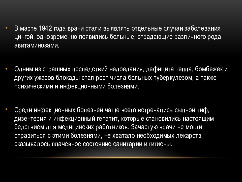 В марте 1942 года врачи стали выявлять отдельные случаи заболевания цингой, одновременно появились больные, страдающие различного рода авитаминозами. Одним из страшных последствий недоедания, дефицита тепла, бомбежек и других ужасов блокады стал рост числа больных туберкулезом, а также психическими и инфекционными болезнями. Среди инфекционных болезней чаще всего встречались сыпной тиф, дизентерия и инфекционный гепатит, которые становились настоящим бедствием для медицинских работников. Зачастую врачи не могли справиться с этими болезнями, не хватало необходимых лекарств, сказывалось плачевное состояние санитарии и гигиены.