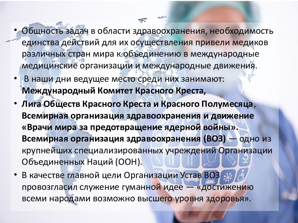 Общность задач в области здравоохранения, необходимость единства действий для их осуществления привели медиков различных стран мира к объединению в международные медицинские организации и международные движения. В наши дни ведущее место среди них занимают: Международный Комитет Красного Креста, Лига Обществ Красного Креста и Красного Полумесяца, Всемирная организация здравоохранения и движение «Врачи мира за предотвращение ядерной войны». Всемирная организация здравоохранения (ВОЗ) — одно из крупнейших специализированных учреждений Организации Объединенных Наций (ООН). В качестве главной цели Организации Устав ВОЗ провозгласил служение гуманной идее — «достижению всеми народами возможно высшего уровня здоровья».
