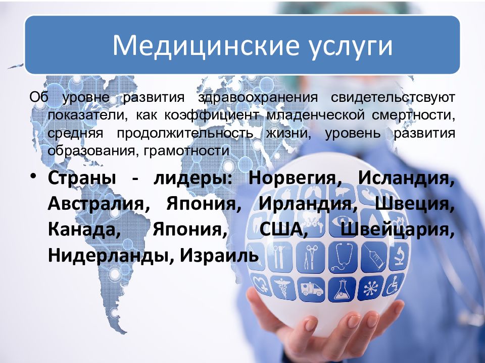 Об уровне развития здравоохранения свидетельстсвуют показатели, как коэффициент младенческой смертности, средняя продолжительность жизни, уровень развития образования, грамотности Страны - лидеры: Норвегия, Исландия, Австралия, Япония, Ирландия, Швеция, Канада, Япония, США, Швейцария, Нидерланды, Израиль