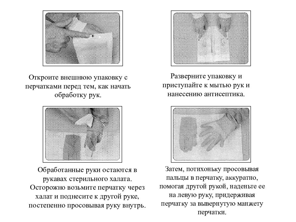 Разверните упаковку и приступайте к мытью рук и нанесению антисептика. Откроите внешнюю упаковку с перчатками перед тем, как начать обработку рук. Обработанные руки остаются в рукавах стерильного халата. Осторожно возьмите перчатку через халат и поднесите к другой руке, постепенно просовывая руку внутрь. Затем, потихоньку просовывая пальцы в перчатку, аккуратно, помогая другой рукой, наденьте ее на левую руку, придерживая перчатку за вывернутую манжету перчатки.