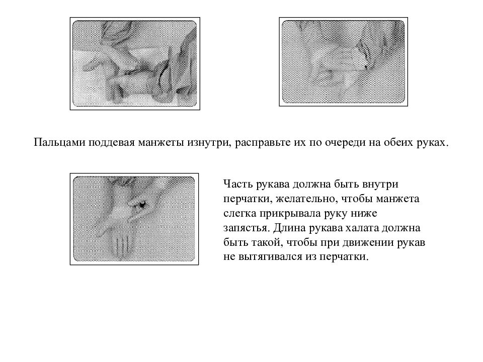 Пальцами поддевая манжеты изнутри, расправьте их по очереди на обеих руках. Часть рукава должна быть внутри перчатки, желательно, чтобы манжета слегка прикрывала руку ниже запястья. Длина рукава халата должна быть такой, чтобы при движении рукав не вытягивался из перчатки.