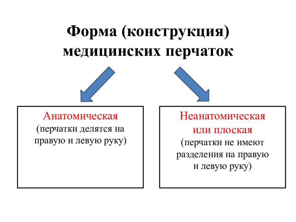 Форма ( конструкция) медицинских перчаток Анатомическая (перчатки делятся на правую и левую руку ) Неанатомическая или плоская (перчатки не имеют разделения на правую и левую руку)