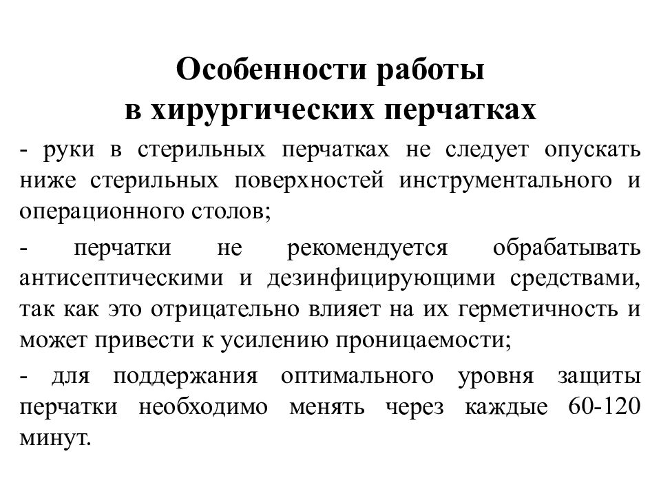 Особенности работы в хирургических перчатках - руки в стерильных перчатках не следует опускать ниже стерильных поверхностей инструментального и операционного столов; - перчатки не рекомендуется обрабатывать антисептическими и дезинфицирующими средствами, так как это отрицательно влияет на их герметичность и может привести к усилению проницаемости; - для поддержания оптимального уровня защиты перчатки необходимо менять через каждые 60-120 минут.