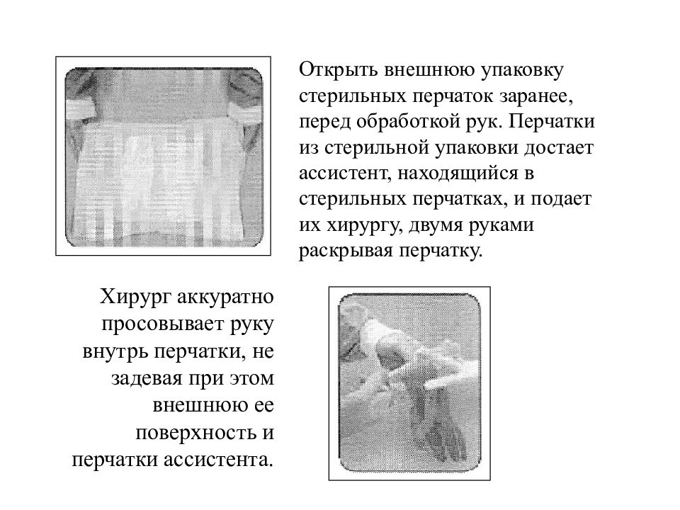 Открыть внешнюю упаковку стерильных перчаток заранее, перед обработкой рук. Перчатки из стерильной упаковки достает ассистент, находящийся в стерильных перчатках, и подает их хирургу, двумя руками раскрывая перчатку. Хирург аккуратно просовывает руку внутрь перчатки, не задевая при этом внешнюю ее поверхность и перчатки ассистента.