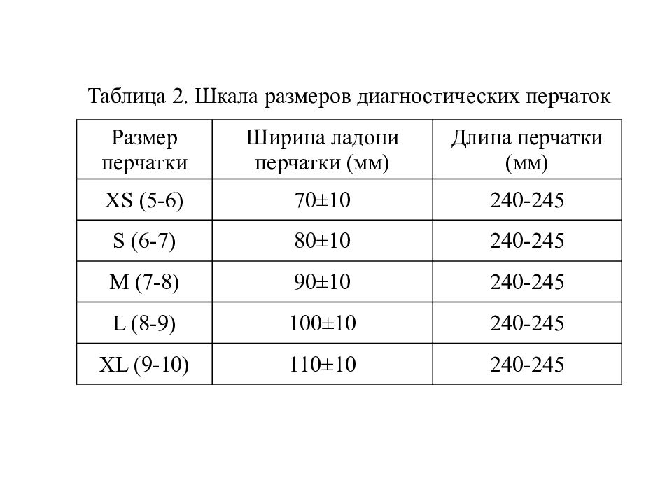 Размер перчатки Ширина ладони перчатки (мм) Длина перчатки (мм) XS (5-6) 70±10 240-245 S (6-7) 80±10 240-245 М (7-8) 90±10 240-245 L (8-9) 100±10 240-245 XL (9-10) 110±10 240-245 Таблица 2. Шкала размеров диагностических перчаток