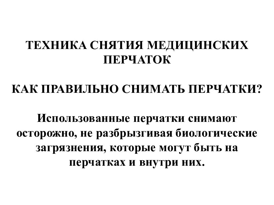 ТЕХНИКА СНЯТИЯ МЕДИЦИНСКИХ ПЕРЧАТОК КАК ПРАВИЛЬНО СНИМАТЬ ПЕРЧАТКИ? Использованные перчатки снимают осторожно, не разбрызгивая биологические загрязнения, которые могут быть на перчатках и внутри них.