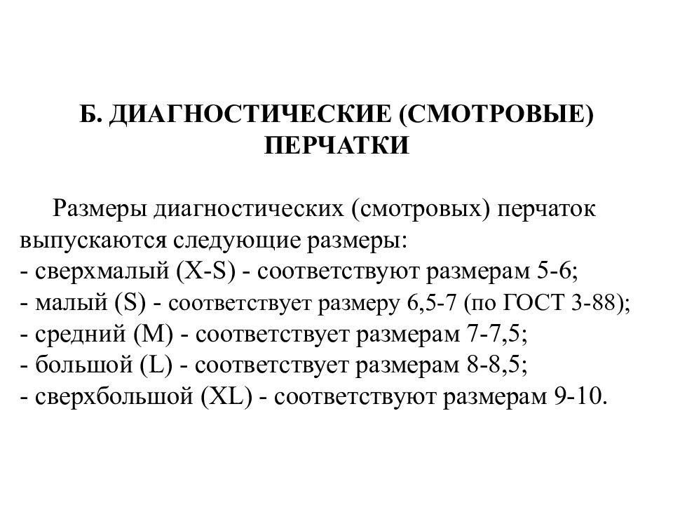 Б. ДИАГНОСТИЧЕСКИЕ (СМОТРОВЫЕ) ПЕРЧАТКИ Размеры диагностических (смотровых) перчаток выпускаются следующие размеры: - сверхмалый (X-S) - соответствуют размерам 5-6; - малый (S) - соответствует размеру 6,5-7 (по ГОСТ 3-88); - средний (М) - соответствует размерам 7-7,5; - большой (L) - соответствует размерам 8-8,5; - сверхбольшой (XL) - соответствуют размерам 9-10.