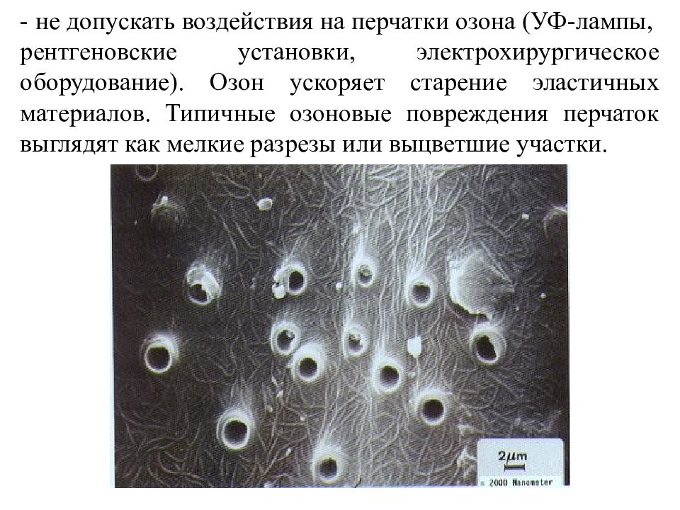- не допускать воздействия на перчатки озона ( УФ-лампы, рентгеновские установки, электрохирургическое оборудование). Озон ускоряет старение эластичных материалов. Типичные озоновые повреждения перчаток выглядят как мелкие разрезы или выцветшие участки.