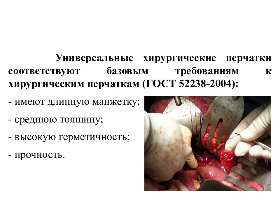 Универсальные хирургические перчатки соответствуют базовым требованиям к хирургическим перчаткам (ГОСТ 52238-2004): - имеют длинную манжетку; - среднюю толщину; - высокую герметичность; - прочность.