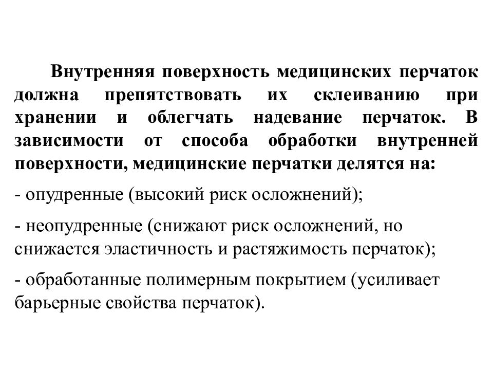 Внутренняя поверхность медицинских перчаток должна препятствовать их склеиванию при хранении и облегчать надевание перчаток. В зависимости от способа обработки внутренней поверхности, медицинские перчатки делятся на: - опудренные (высокий риск осложнений); - неопудренные (снижают риск осложнений, но снижается эластичность и растяжимость перчаток); - обработанные полимерным покрытием (усиливает барьерные свойства перчаток).