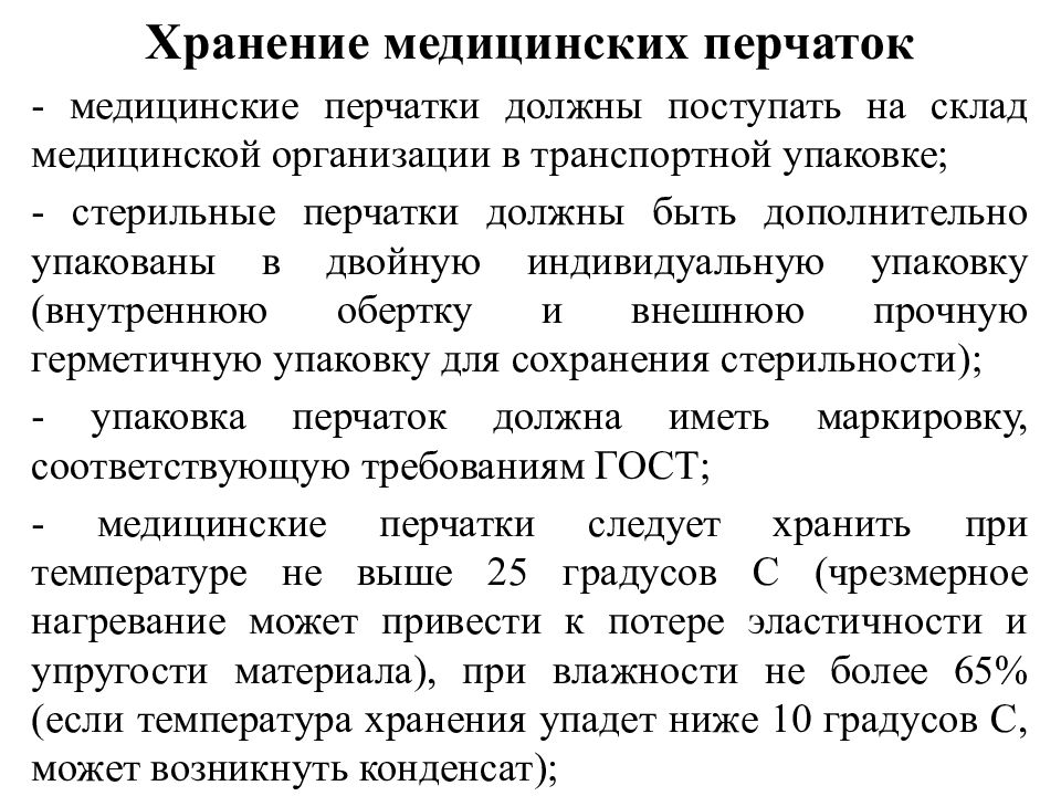 Хранение медицинских перчаток - медицинские перчатки должны поступать на склад медицинской организации в транспортной упаковке; - стерильные перчатки должны быть дополнительно упакованы в двойную индивидуальную упаковку (внутреннюю обертку и внешнюю прочную герметичную упаковку для сохранения стерильности); - упаковка перчаток должна иметь маркировку, соответствующую требованиям ГОСТ; - медицинские перчатки следует хранить при температуре не выше 25 градусов С (чрезмерное нагревание может привести к потере эластичности и упругости материала), при влажности не более 65% (если температура хранения упадет ниже 10 градусов С, может возникнуть конденсат );