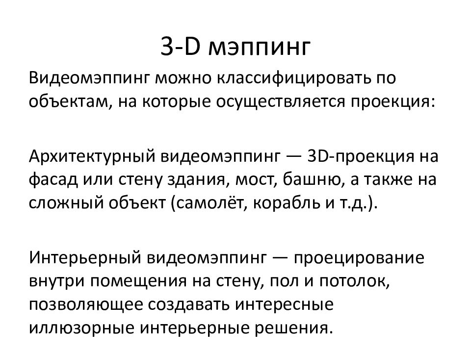 Видеомэппинг можно классифицировать по объектам, на которые осуществляется проекция: Архитектурный видеомэппинг — 3D-проекция на фасад или стену здания, мост, башню, а также на сложный объект (самолёт, корабль и т.д.). Интерьерный видеомэппинг — проецирование внутри помещения на стену, пол и потолок, позволяющее создавать интересные иллюзорные интерьерные решения.