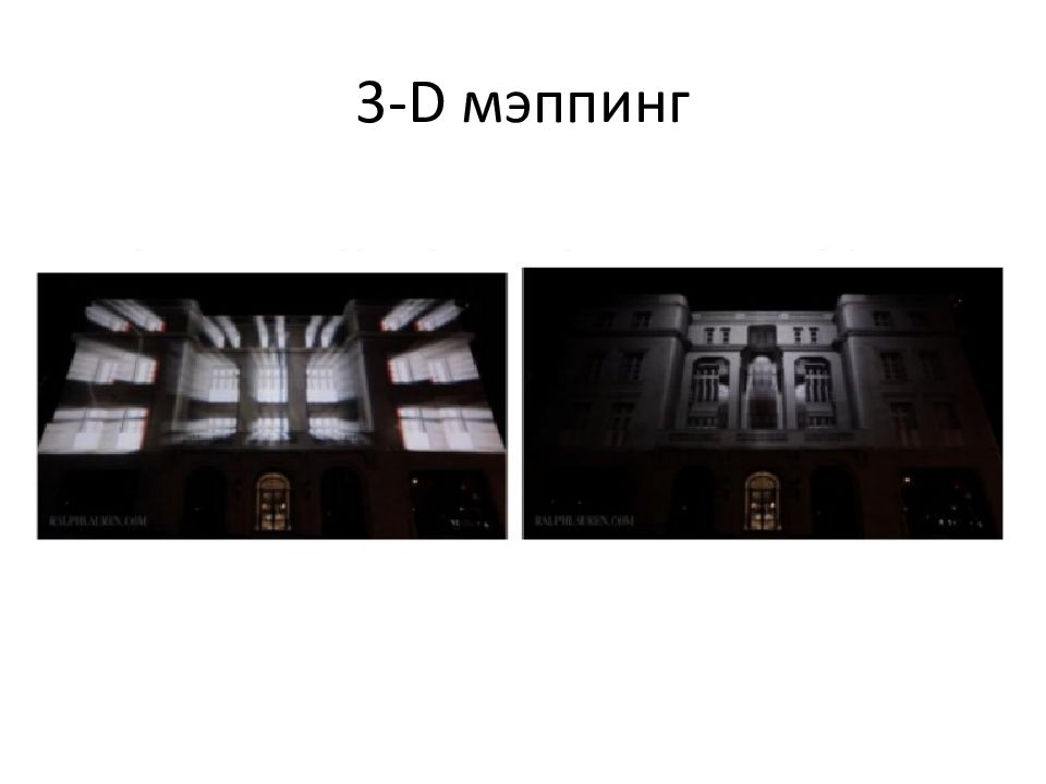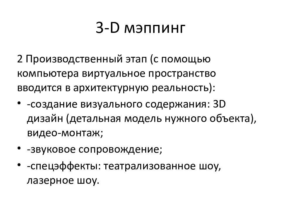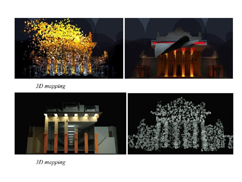 2 Производственный этап (с помощью компьютера виртуальное пространство вводится в архитектурную реальность): -создание визуального содержания: 3D дизайн (детальная модель нужного объекта), видео-монтаж; -звуковое сопровождение; -спецэффекты: театрализованное шоу, лазерное шоу.