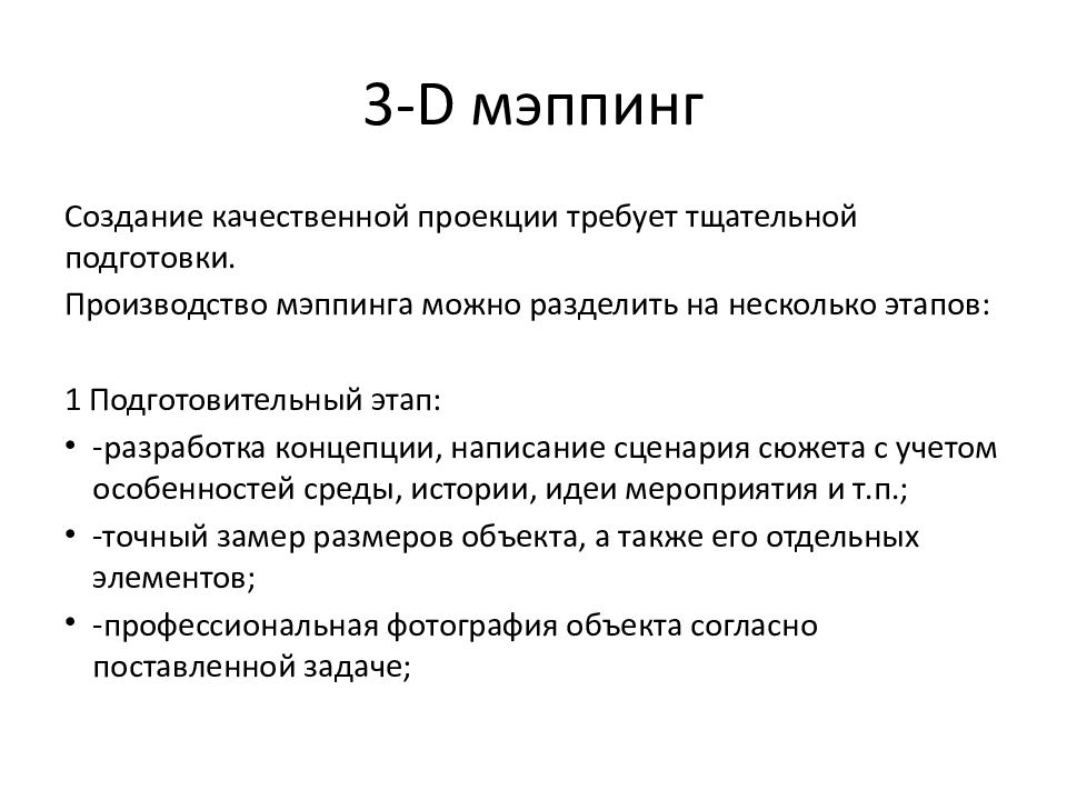 Создание качественной проекции требует тщательной подготовки. Производство мэппинга можно разделить на несколько этапов: 1 Подготовительный этап: -разработка концепции, написание сценария сюжета с учетом особенностей среды, истории, идеи мероприятия и т.п.; -точный замер размеров объекта, а также его отдельных элементов; -профессиональная фотография объекта согласно поставленной задаче ;