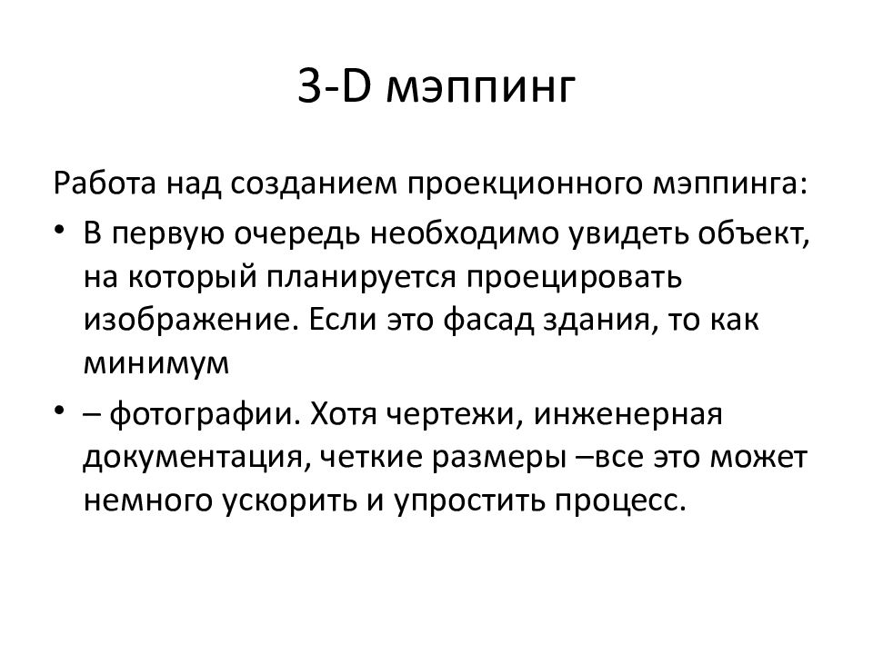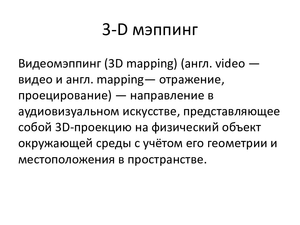 Видеомэппинг (3D mapping ) (англ. video — видео и англ. mapping — отражение, проецирование) — направление в аудиовизуальном искусстве, представляющее собой 3D-проекцию на физический объект окружающей среды с учётом его геометрии и местоположения в пространстве.