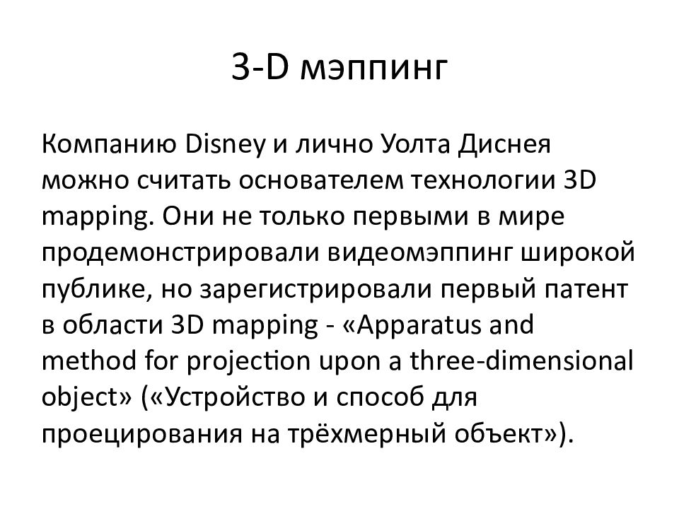 Компанию Disney и лично Уолта Диснея можно считать основателем технологии 3D mapping. Они не только первыми в мире продемонстрировали видеомэппинг широкой публике, но зарегистрировали первый патент в области 3D mapping - « Apparatus and method for projection upon a three-dimensional object » («Устройство и способ для проецирования на трёхмерный объект»).