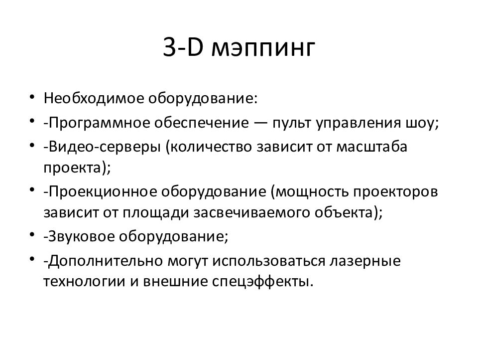 Необходимое оборудование: -Программное обеспечение — пульт управления шоу; -Видео-серверы (количество зависит от масштаба проекта); -Проекционное оборудование (мощность проекторов зависит от площади засвечиваемого объекта); -Звуковое оборудование; -Дополнительно могут использоваться лазерные технологии и внешние спецэффекты.