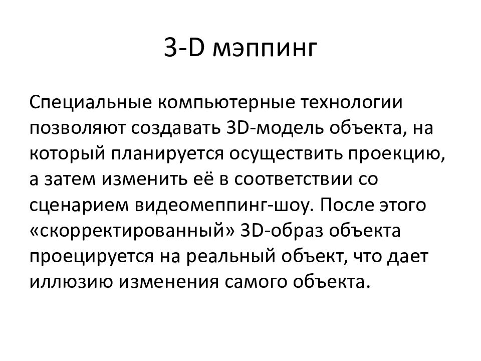 Специальные компьютерные технологии позволяют создавать 3D-модель объекта, на который планируется осуществить проекцию, а затем изменить её в соответствии со сценарием видеомеппинг -шоу. После этого « скорректированный» 3D-образ объекта проецируется на реальный объект, что дает иллюзию изменения самого объекта.