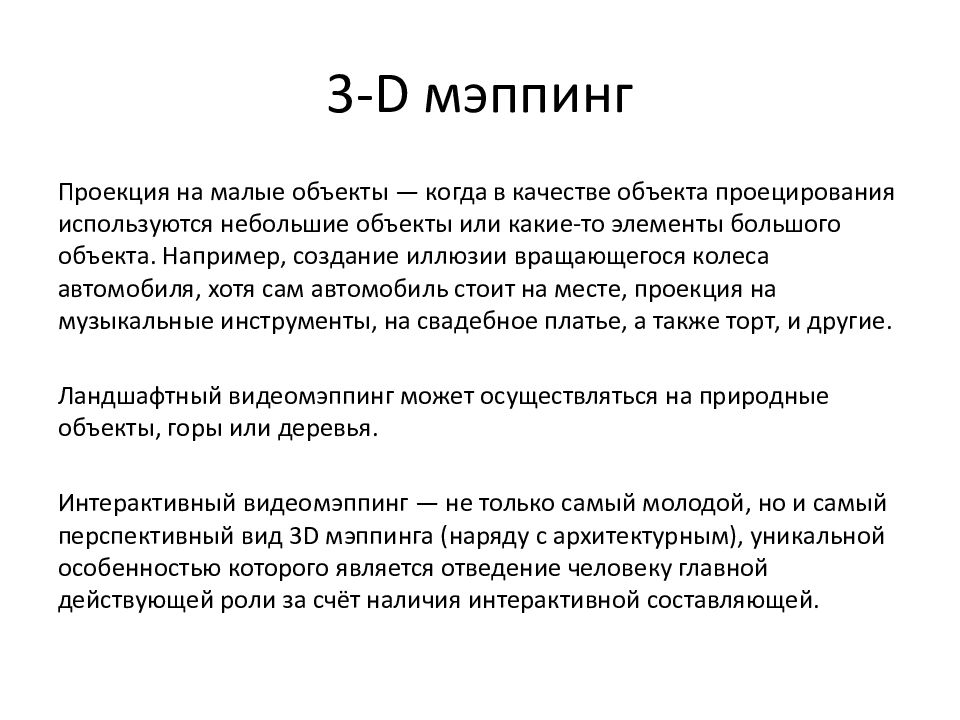 Проекция на малые объекты — когда в качестве объекта проецирования используются небольшие объекты или какие-то элементы большого объекта. Например, создание иллюзии вращающегося колеса автомобиля, хотя сам автомобиль стоит на месте, проекция на музыкальные инструменты, на свадебное платье, а также торт, и другие. Ландшафтный видеомэппинг может осуществляться на природные объекты, горы или деревья. Интерактивный видеомэппинг — не только самый молодой, но и самый перспективный вид 3D мэппинга (наряду с архитектурным), уникальной особенностью которого является отведение человеку главной действующей роли за счёт наличия интерактивной составляющей.