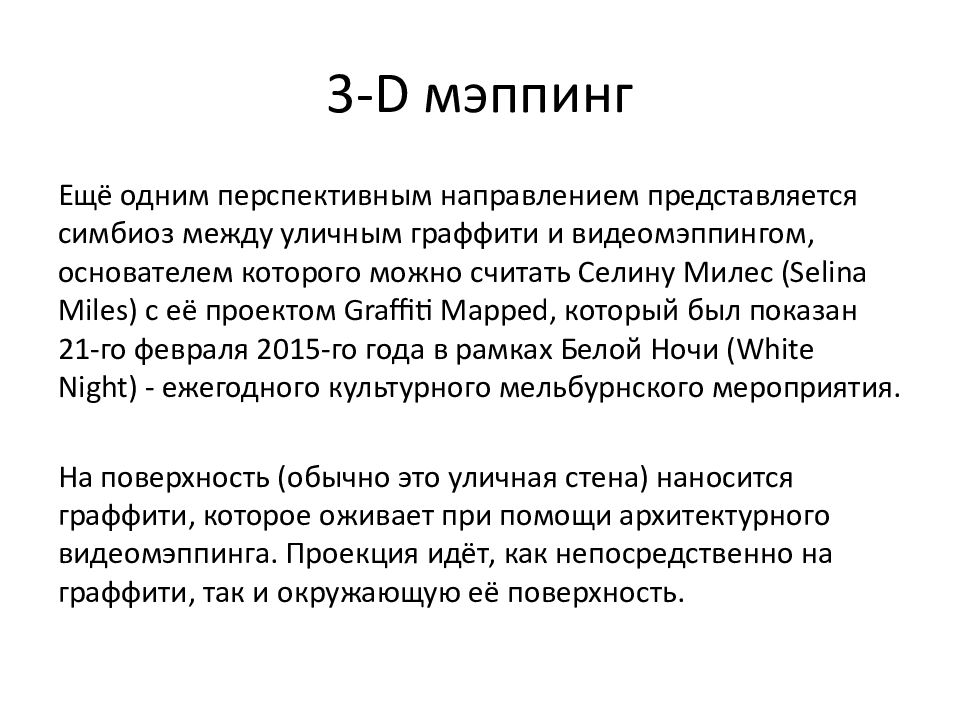 Ещё одним перспективным направлением представляется симбиоз между уличным граффити и видеомэппингом, основателем которого можно считать Селину Милес ( Selina Miles ) с её проектом Graffiti Mapped, который был показан 21-го февраля 2015-го года в рамках Белой Ночи ( White Night ) - ежегодного культурного мельбурнского мероприятия. На поверхность (обычно это уличная стена) наносится граффити, которое оживает при помощи архитектурного видеомэппинга. Проекция идёт, как непосредственно на граффити, так и окружающую её поверхность.