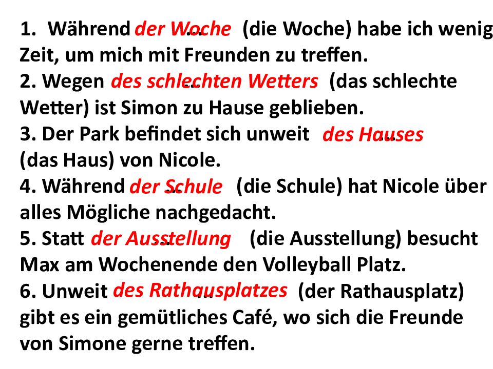 Während... (die Woche) habe ich wenig Zeit, um mich mit Freunden zu treffen. 2. Wegen... (das schlechte Wetter) ist Simon zu Hause geblieben. 3. Der Park befindet sich unweit... (das Haus) von Nicole. 4. Während... (die Schule) hat Nicole über alles Mögliche nachgedacht. 5. Statt... (die Ausstellung) besucht Max am Wochenende den Volleyball Platz. 6. Unweit... (der Rathausplatz) gibt es ein gemütliches Café, wo sich die Freunde von Simone gerne treffen. der Woche des schlechten Wetters des Hauses der Schule der Ausstellung des Rathausplatzes
