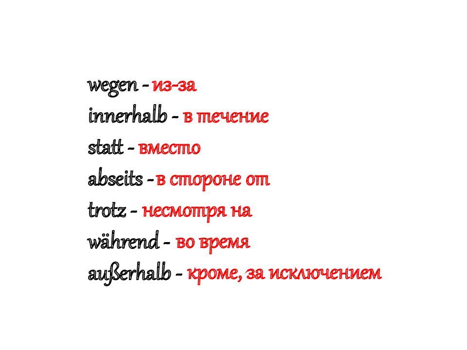 wegen - innerhalb - statt - abseits - trotz - während - außerhalb - из-за в течение вместо в стороне от несмотря на во время кроме, за исключением