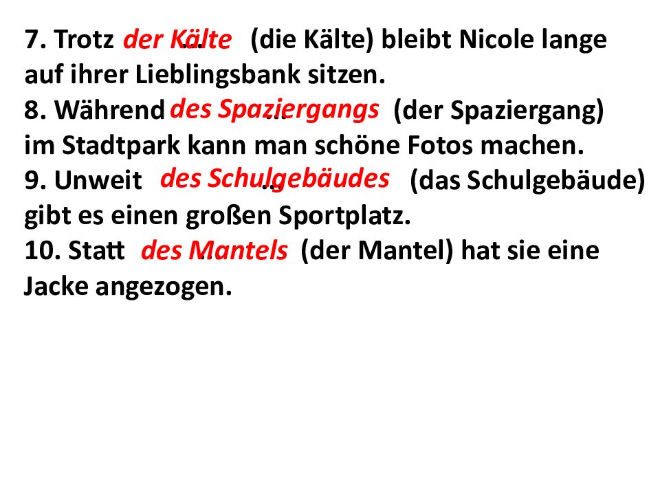 7. Trotz... (die Kälte) bleibt Nicole lange auf ihrer Lieblingsbank sitzen. 8. Während... (der Spaziergang) im Stadtpark kann man schöne Fotos machen. 9. Unweit... (das Schulgebäude) gibt es einen großen Sportplatz. 10. Statt... (der Mantel) hat sie eine Jacke angezogen. der Kälte des Spaziergangs des Schulgebäudes des Mantels