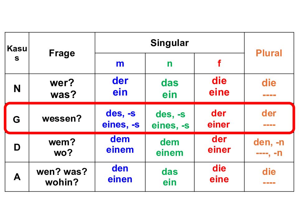 Kasus Frage Singular Plural m n f N wer? was? der ein das ein die eine die ---- D wem? wo? dem einem dem einem der einer den, - n ----, - n A wen? was? wohin? den einen das ein die eine die ---- wessen? G der einer des, -s eines, -s des, -s eines, -s der ----