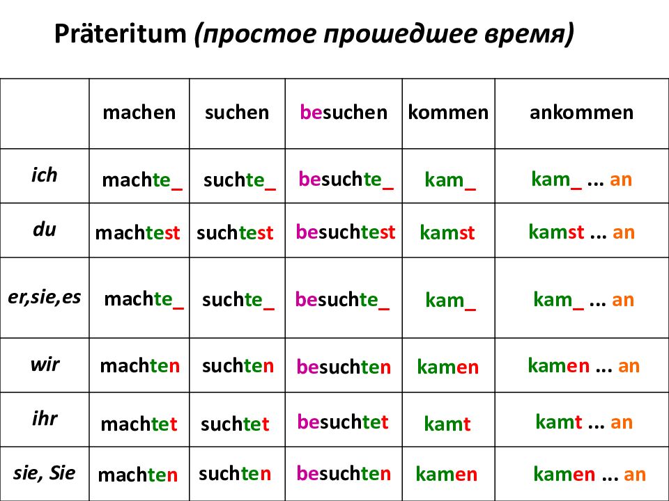 Präteritum (простое прошедшее время) machen su chen be suchen kommen ankommen ich du er,sie,es wir ihr sie, Sie mach te _ mach te st mach te _ mach te n mach te t mach te n such te _ such te st such te _ such te n such te t such te n be such te _ be such te st be such te _ be such te n be such te t be such te n kam _ kam st kam _ kam en kam t kam en kam _... an kam st... an kam _... an kam en... an kam t... an kam en... an