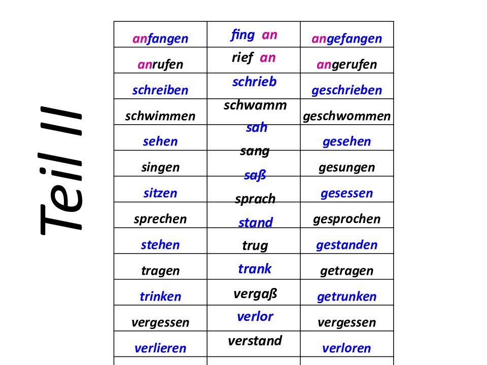 an fangen an gefangen an rufen an gerufen schreiben geschrieben schwimmen geschwommen sehen gesehen singen gesungen sitzen gesessen sprechen gesprochen stehen gestanden tragen getragen trinken getrunken vergessen vergessen verlieren verloren verstehen verstanden fing an rief an schrieb schwamm sah sang sa ß sprach stand trug trank verga ß verlor verstand Teil II