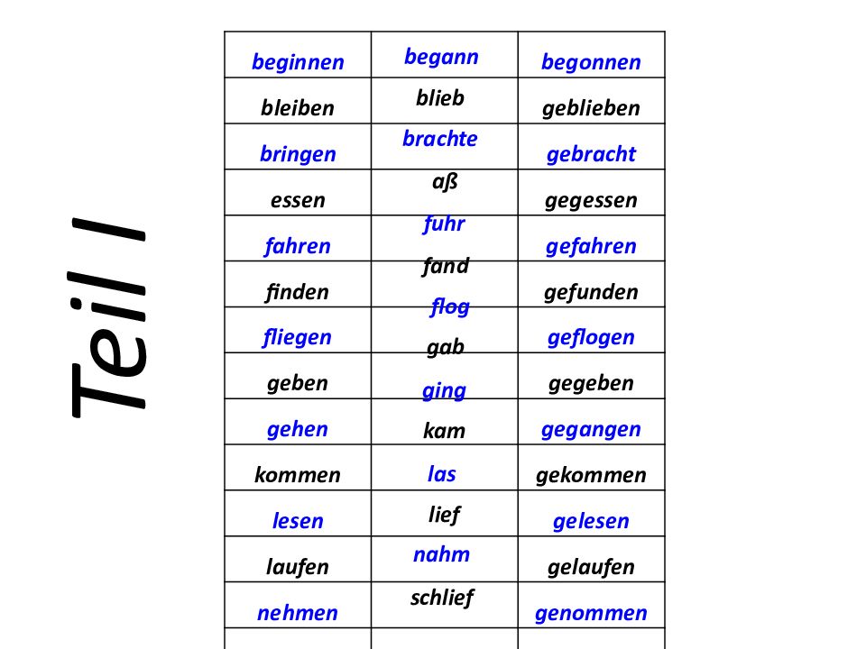 beginnen begonnen bleiben geblieben bringen gebracht essen gegessen fahren gefahren finden gefunden fliegen geflogen geben gegeben gehen gegangen kommen gekommen lesen gelesen laufen gelaufen nehmen genommen schlafen geschlafen begann blieb brachte a ß fuhr fand flog gab kam las lief nahm schlief ging Teil I