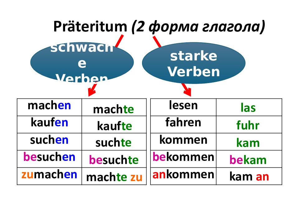 Präteritum (2 форма глагола) schwache Verben starke Verben mach en kauf en such en be such en zu mach en lesen fahren kommen be kommen an kommen mach te kauf te such te be such te mach te zu las fuhr kam be kam kam an