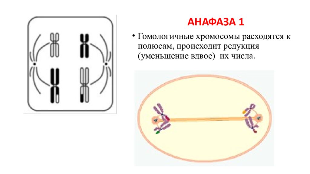 АНАФАЗА 1 Гомологичные хромосомы расходятся к полюсам, происходит редукция (уменьшение вдвое) их числа.