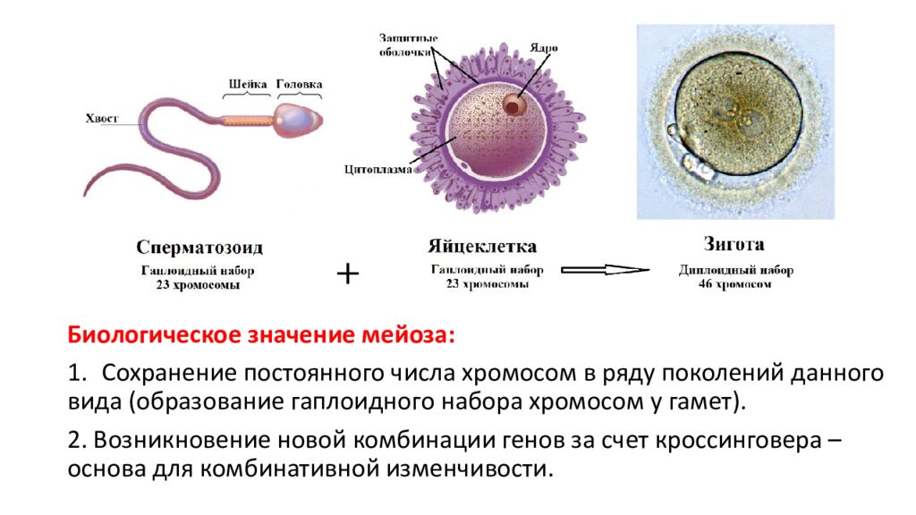 Биологическое значение мейоза: 1. Сохранение постоянного числа хромосом в ряду поколений данного вида (образование гаплоидного набора хромосом у гамет). 2. Возникновение новой комбинации генов за счет кроссинговера – основа для комбинативной изменчивости.