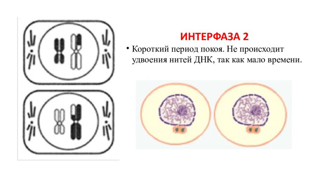 ИНТЕРФАЗА 2 Короткий период покоя. Не происходит удвоения нитей ДНК, так как мало времени.