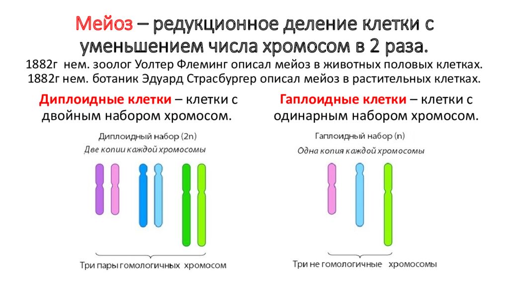 Диплоидные клетки – клетки с двойным набором хромосом. Гаплоидные клетки – клетки с одинарным набором хромосом.