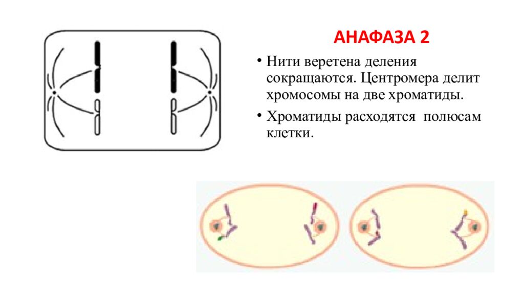 АНАФАЗА 2 Нити веретена деления сокращаются. Центромера делит хромосомы на две хроматиды. Хроматиды расходятся полюсам клетки.